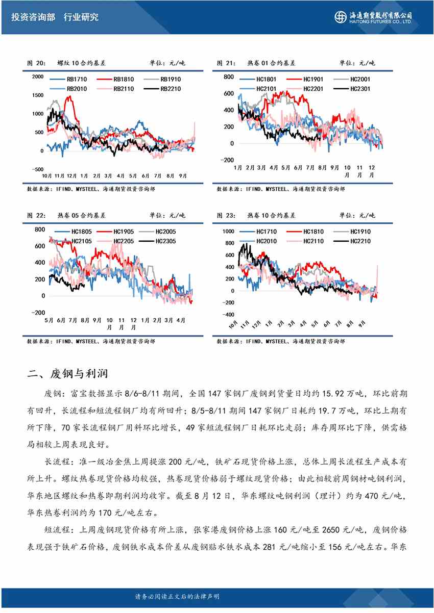 上周钢材期货盘面价格震荡运行,现货价格震荡偏强。上周螺纹钢2210合约上涨3.18%至4150元/吨,热轧卷板2210合约上涨2.43%至4087元/吨。螺纹钢和热卷近远月价差小幅走强;螺纹和热卷现货表现略不及期货,基差小幅走弱;期货方面热卷主力合约表现略弱于螺纹,卷螺价差小幅走弱;铁矿石表现略弱于成材,螺矿主力比价小幅走强。