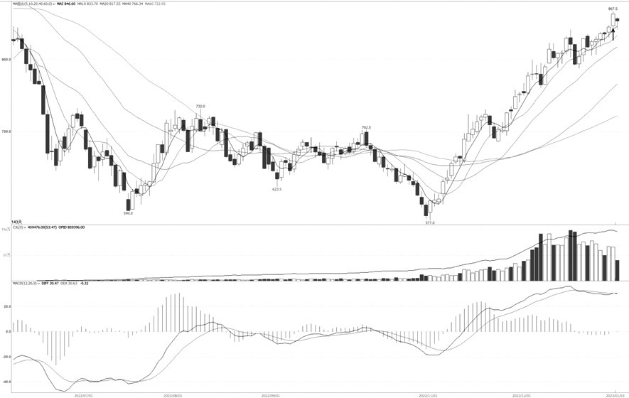 自去年11初以来,铁矿石2305合约呈现9周连涨,5周均线对期价的支撑明显。日线上,去年11月7日突破20天均线后,期价始终维持在20天均线之上,中短期均线保持多头排列,短期均线的乖离率并不大,对期价的助涨作用明确。近10个交易日,期价和macd指标显示顶部背离状态,成交呈缩减态势,持仓持续放大,预示多空分歧加大。综合看,铁矿石振荡上行,注意获利回吐风险。操作上,若期价不跌破10天均线,可以适量关注做多机会。