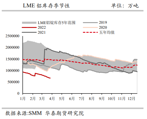 库存方面,根据smm,4月6日,国内铝锭库存105.4万吨,较节前累库1.3万吨。4月7日,lme铝库存较上一交易日减少100吨至61.98万吨。