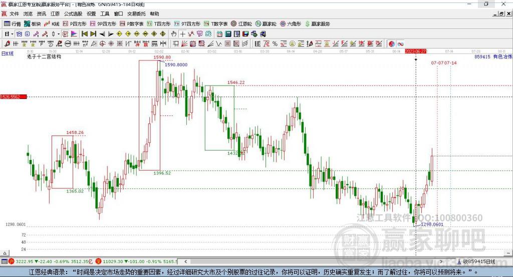 有色冶炼加工概念赢家十二宫工具展示:有色冶炼加工(859415)概念今日点位最高点1436.08,最低点1369.88,今日涨幅3.08%,今日日线以大阳线收盘,近15日呈上涨走势,从最近一个下跌结构形成到现在点位运行了75个交易日,它的关键点位为:顶部红色阻力线1546.22,警戒线1505.37,下跌结构底部为1432.02,按照工具信号规则,当前跌破下跌结构底部1432.02点位置,下跌通道已打开,目标看至下方支撑带1411.64点-1365.02点。时间方面7月7日时间窗口。